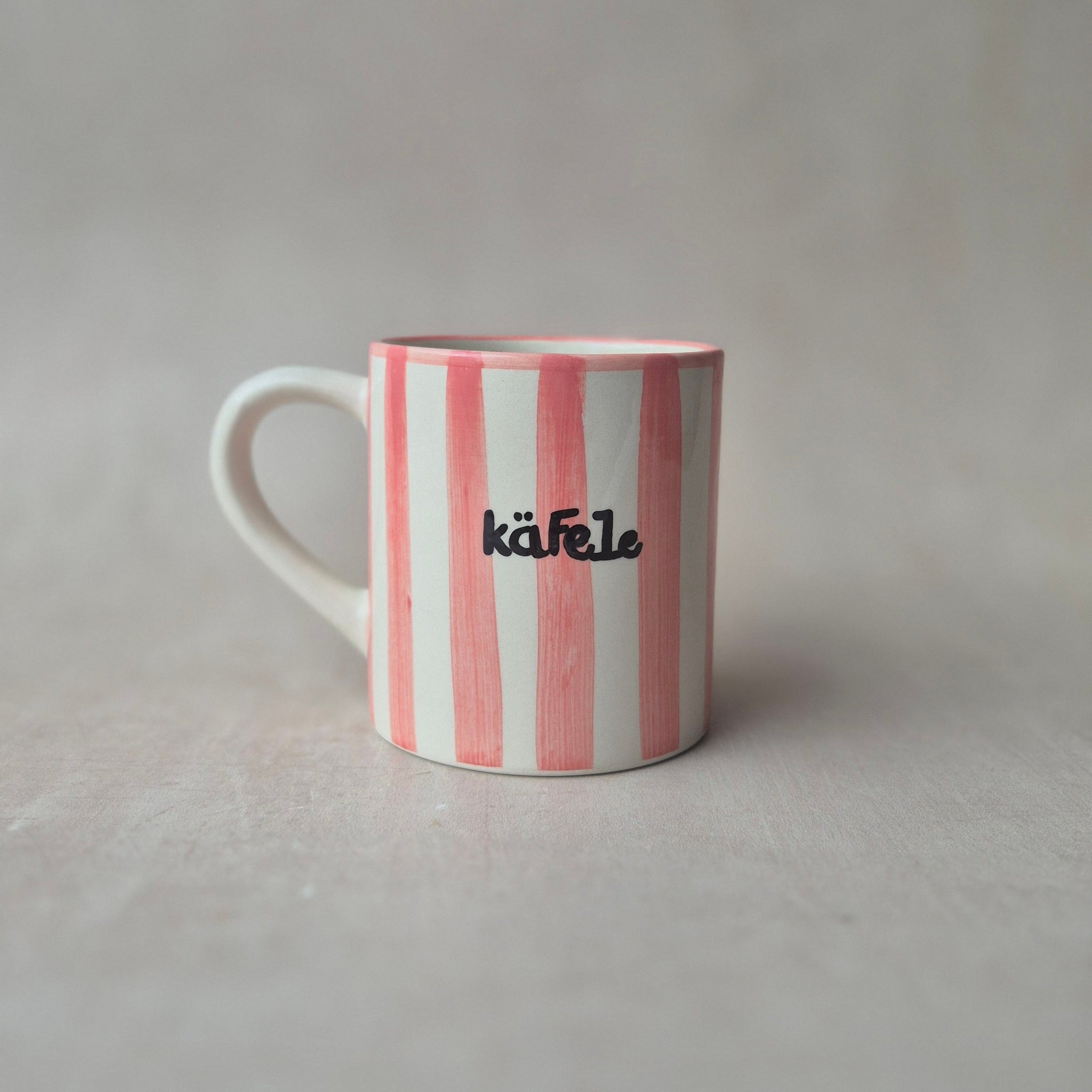 Exklusive alma barru x bärndütsch Tasse, handgefertigt und handbemalt in Portugal, Farbe: gestreift rosa mit schwarzer Aufschrift