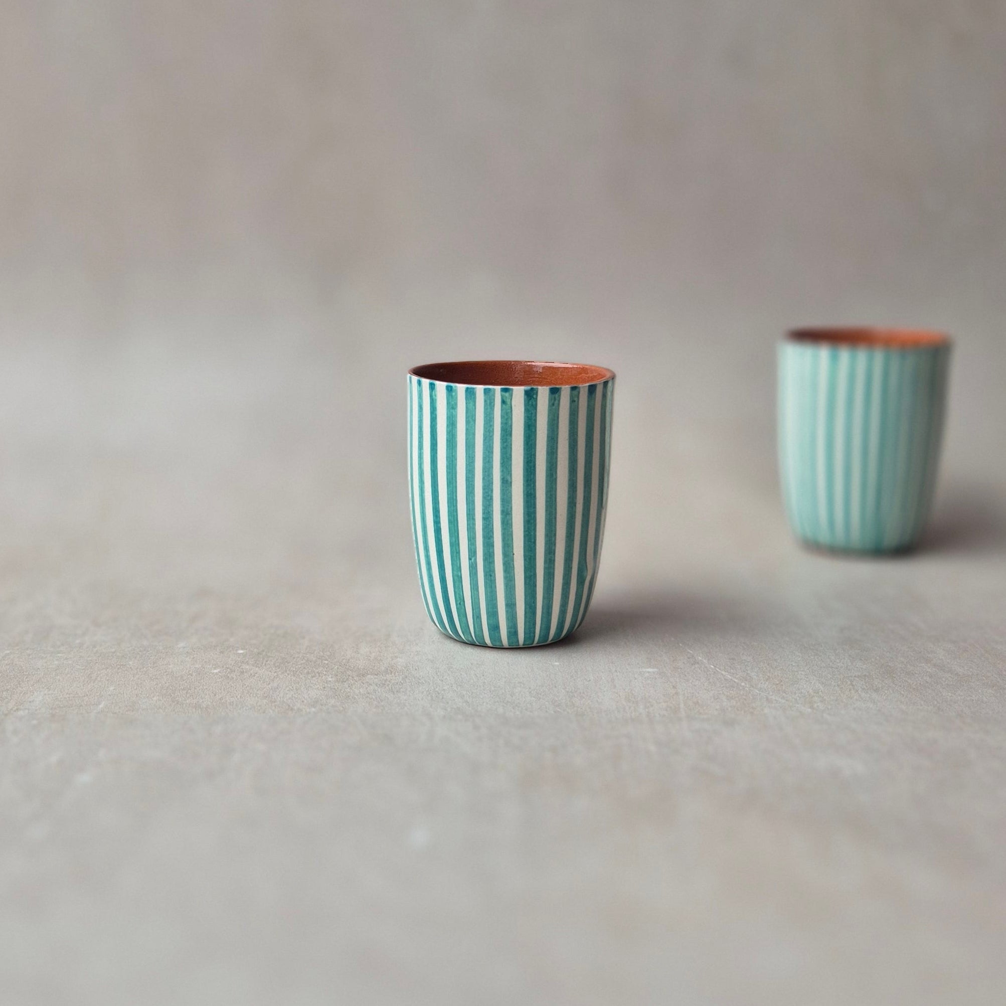 Espressobecher aus Keramik, handgefertigt und handbemalt in Portugal, Farbe: gestreift tropical