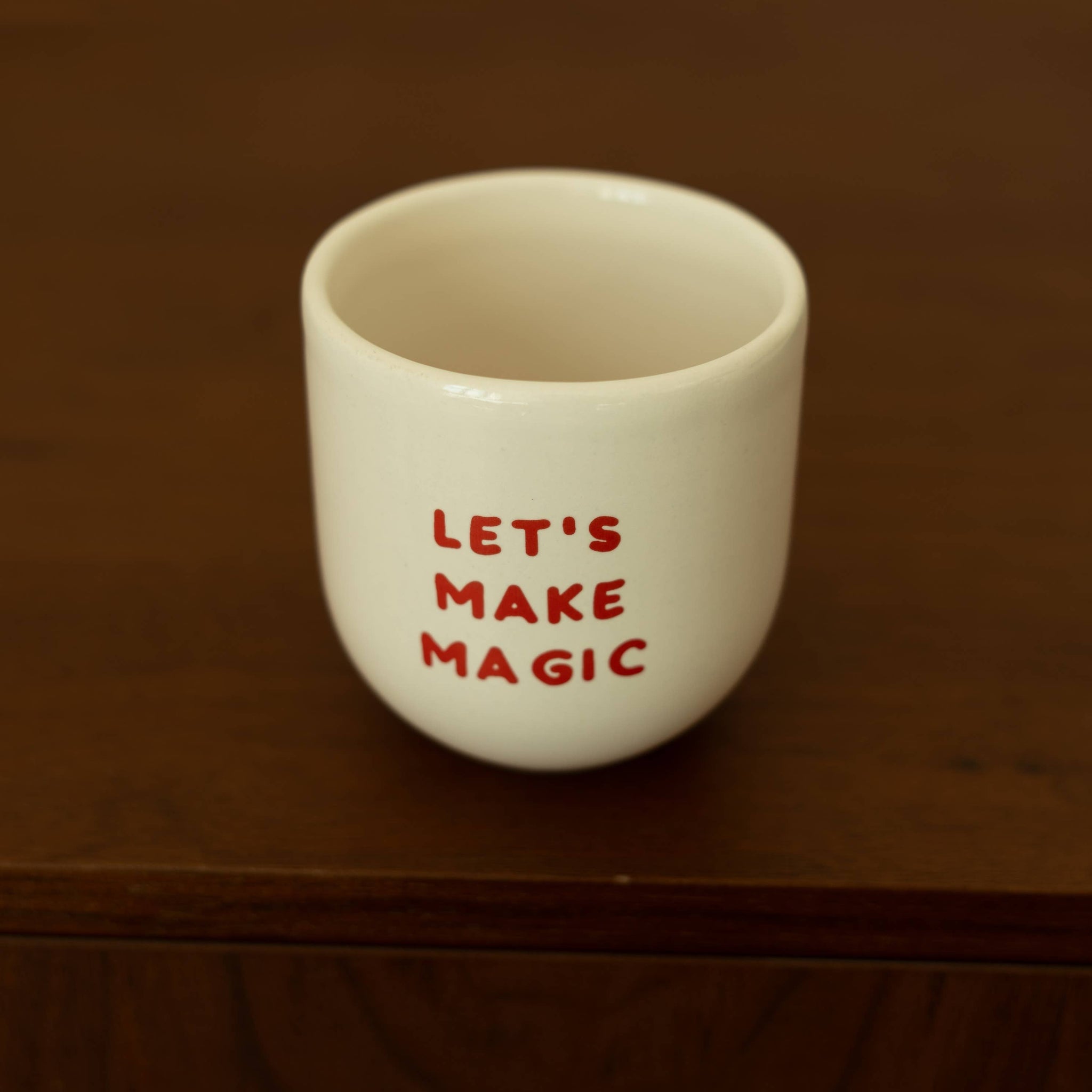 Weisser Kaffeebecher aus Steingut mit glossy Glasur und Aufschrift "Let's make magic". Die Becher werden in Rumänien handgefertigt. Die Aufschriften sind von Hand gesetzt, daher sind keine zwei Becher gleich.