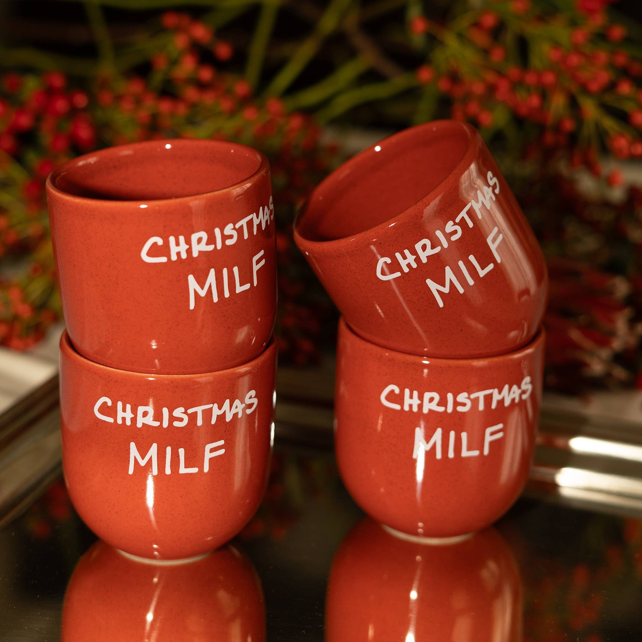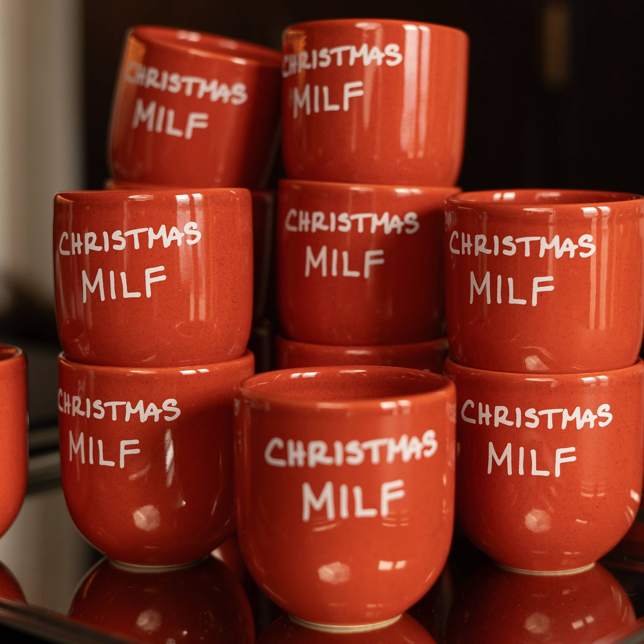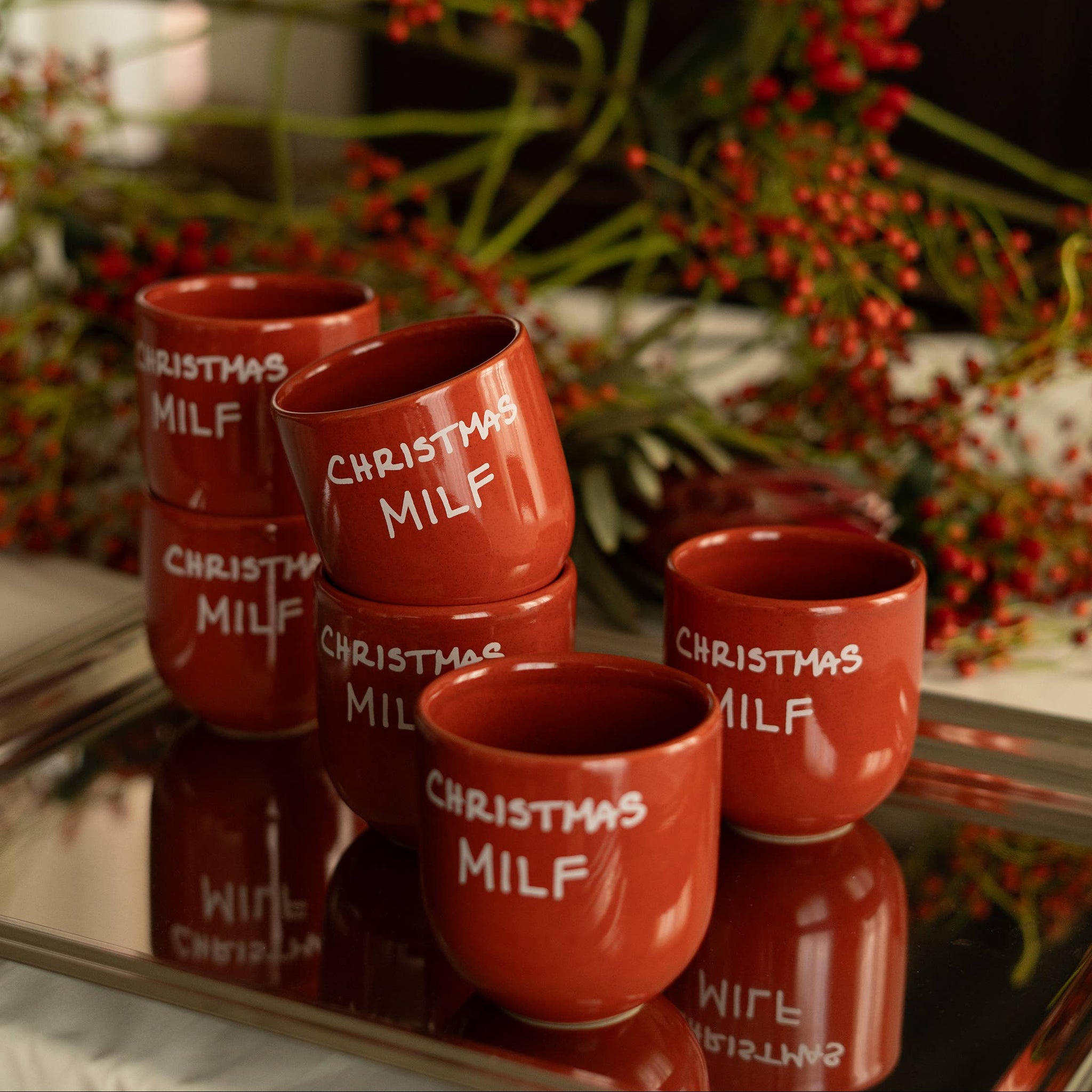 Roter Kaffeebecher aus Steingut mit glossy Glasur und Aufschrift "Christmas MILF". Die Becher werden in Rumänien handgefertigt. Die Aufschriften sind von Hand gesetzt, daher sind keine zwei Becher gleich.