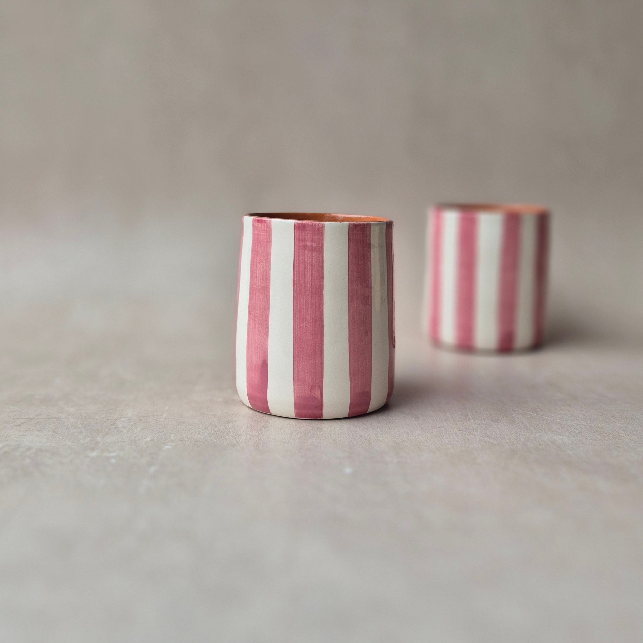 Kaffeebecher aus Keramik, handgefertigt und handbemalt in Portugal, Farbe: breit gestreift rosa
