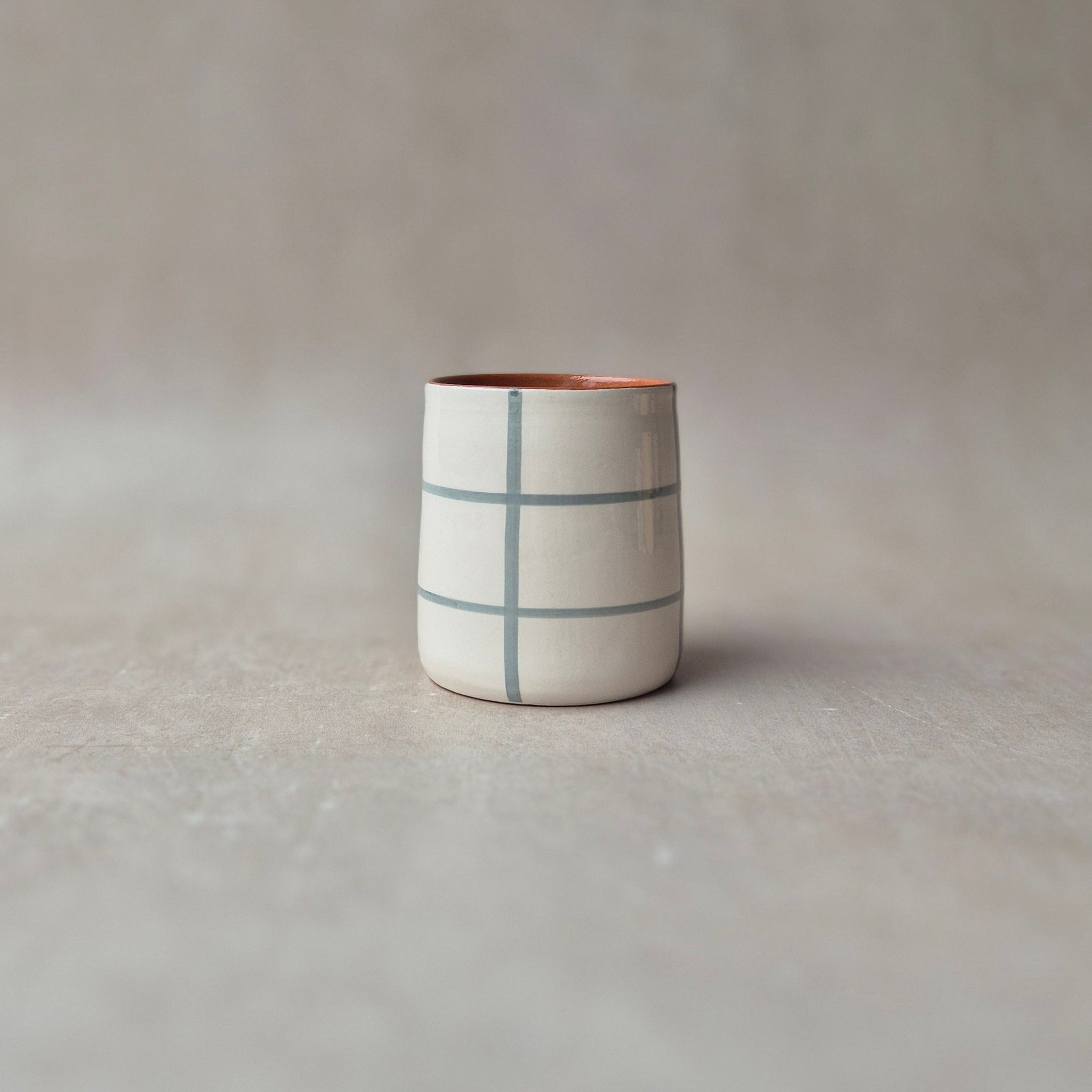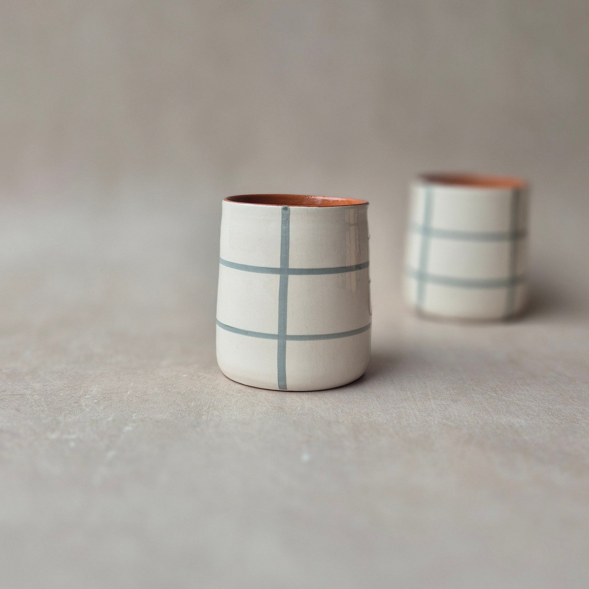 Kaffeebecher aus Keramik, handgefertigt und handbemalt in Portugal, Farbe: kariert eukalyptus