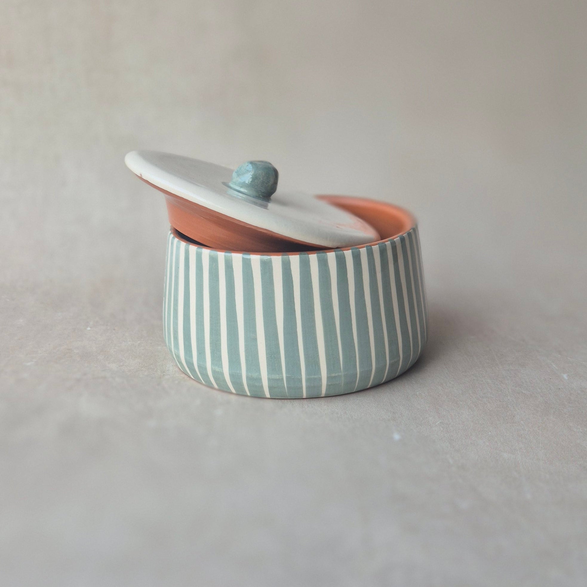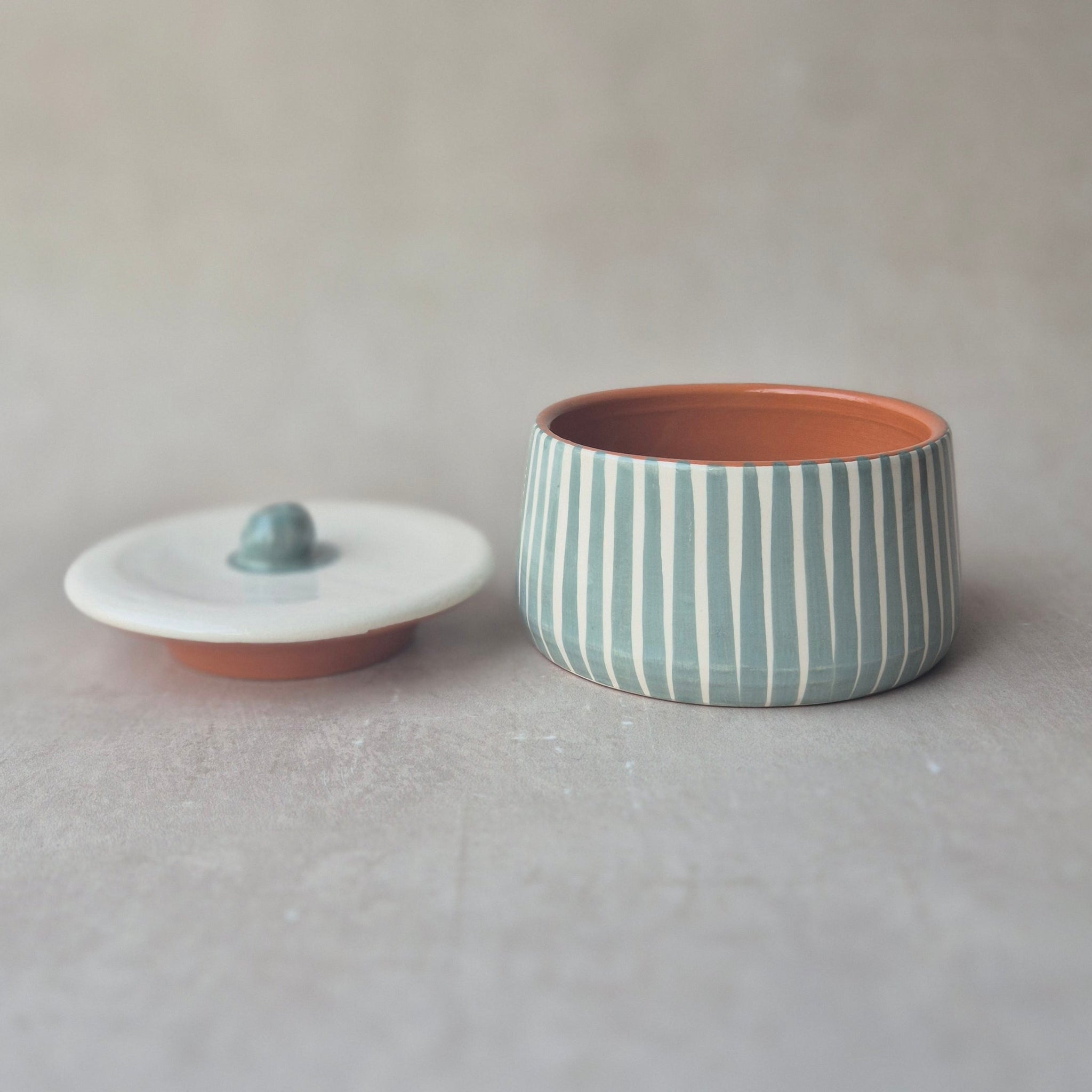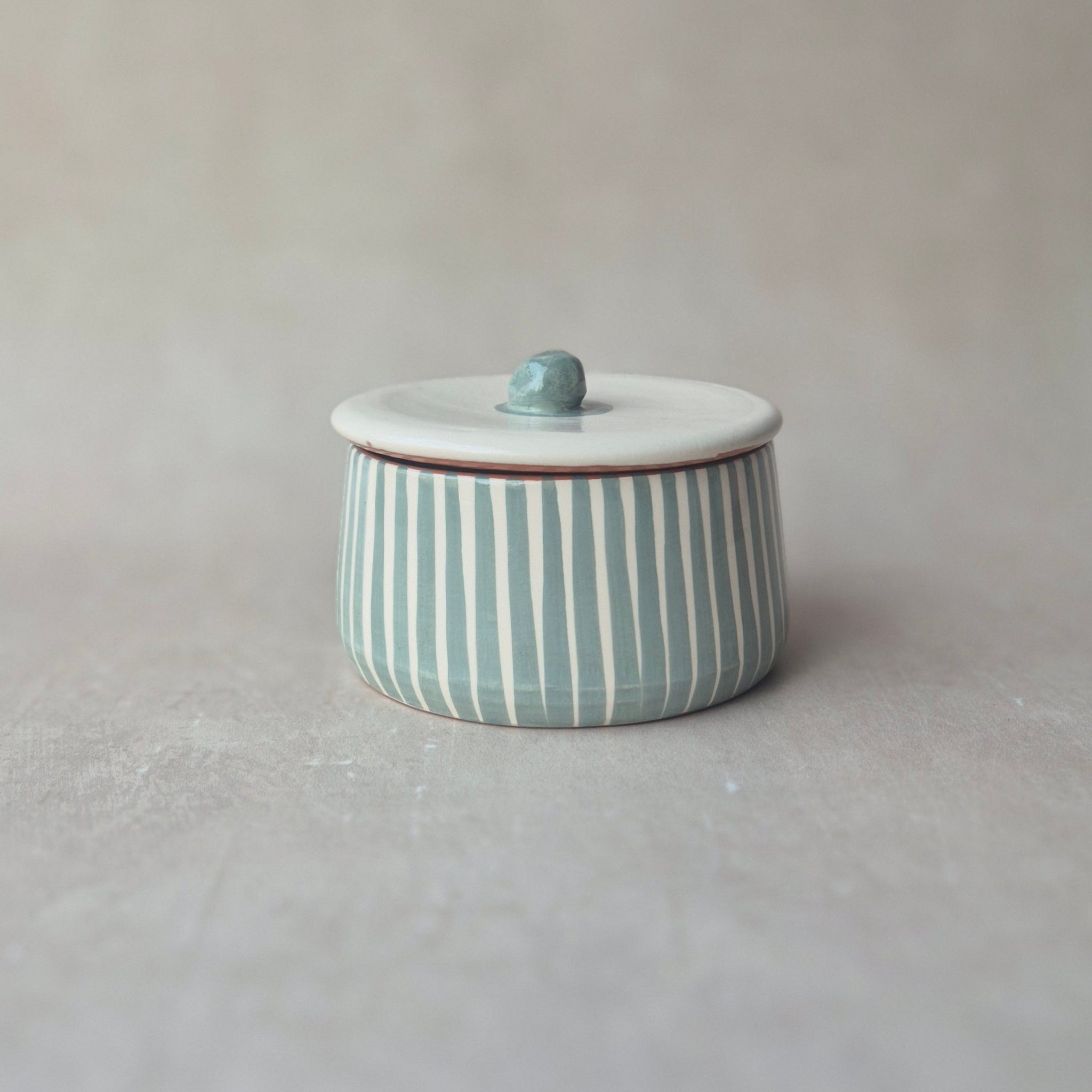 Zauberhafte Keramikdose mit Deckel für Schmuck, Zucker oder sonstige Schätze, handgefertigt und handbemalt in Portugal, Farbe: gestreift eukalyptus