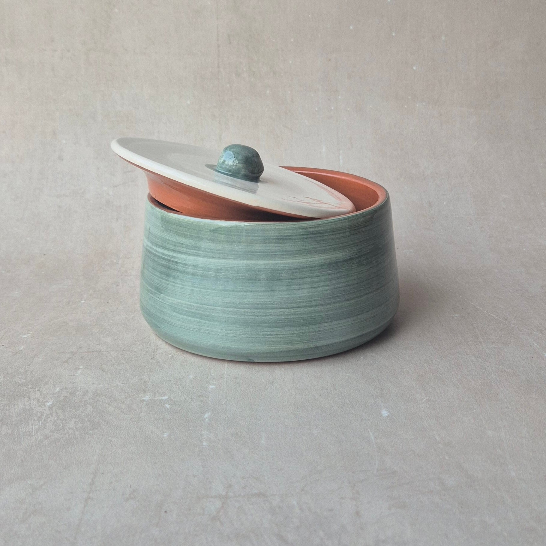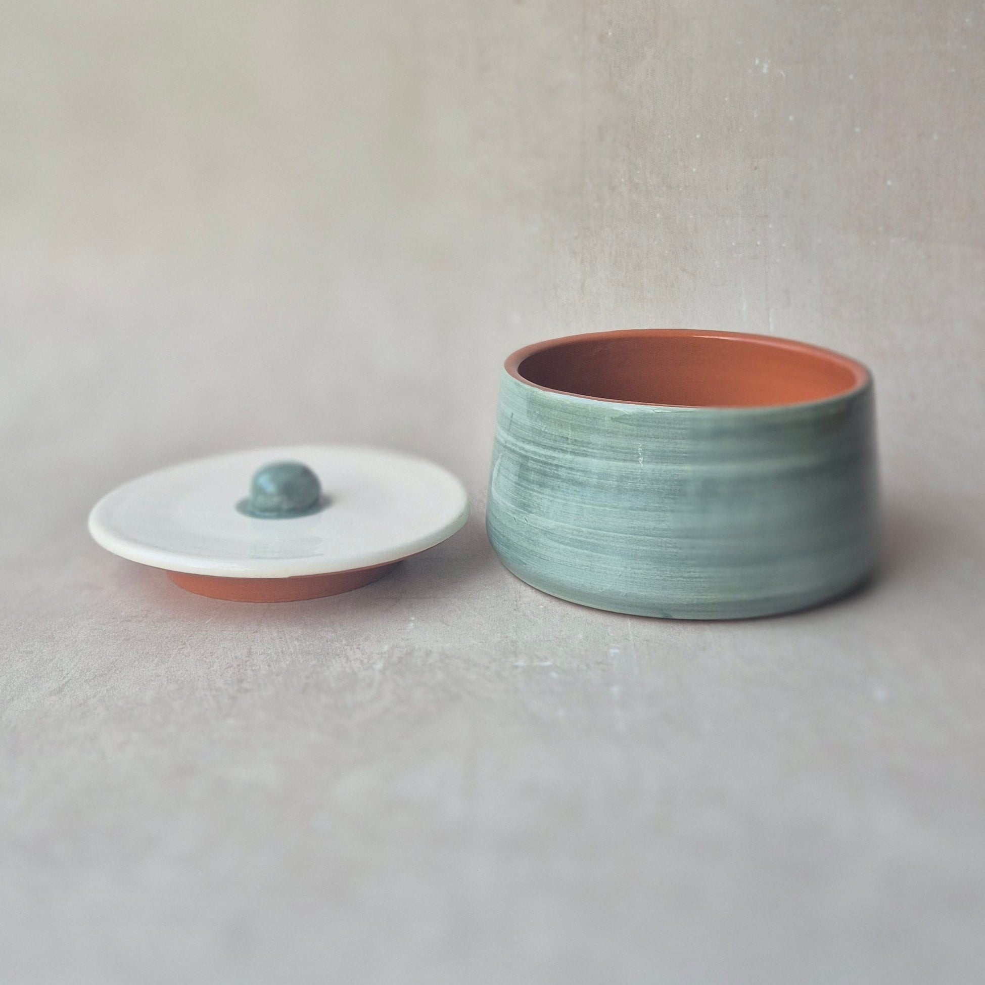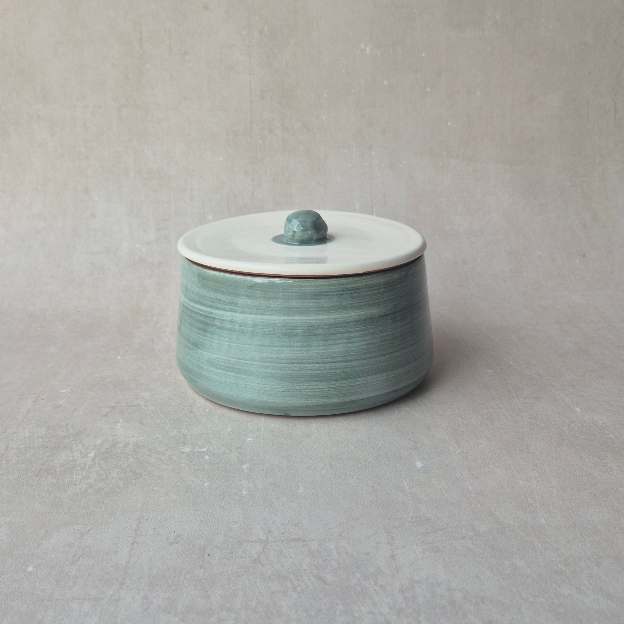 Zauberhafte Keramikdose mit Deckel für Schmuck, Zucker oder sonstige Schätze, handgefertigt und handbemalt in Portugal, Farbe: uni eukalyptus