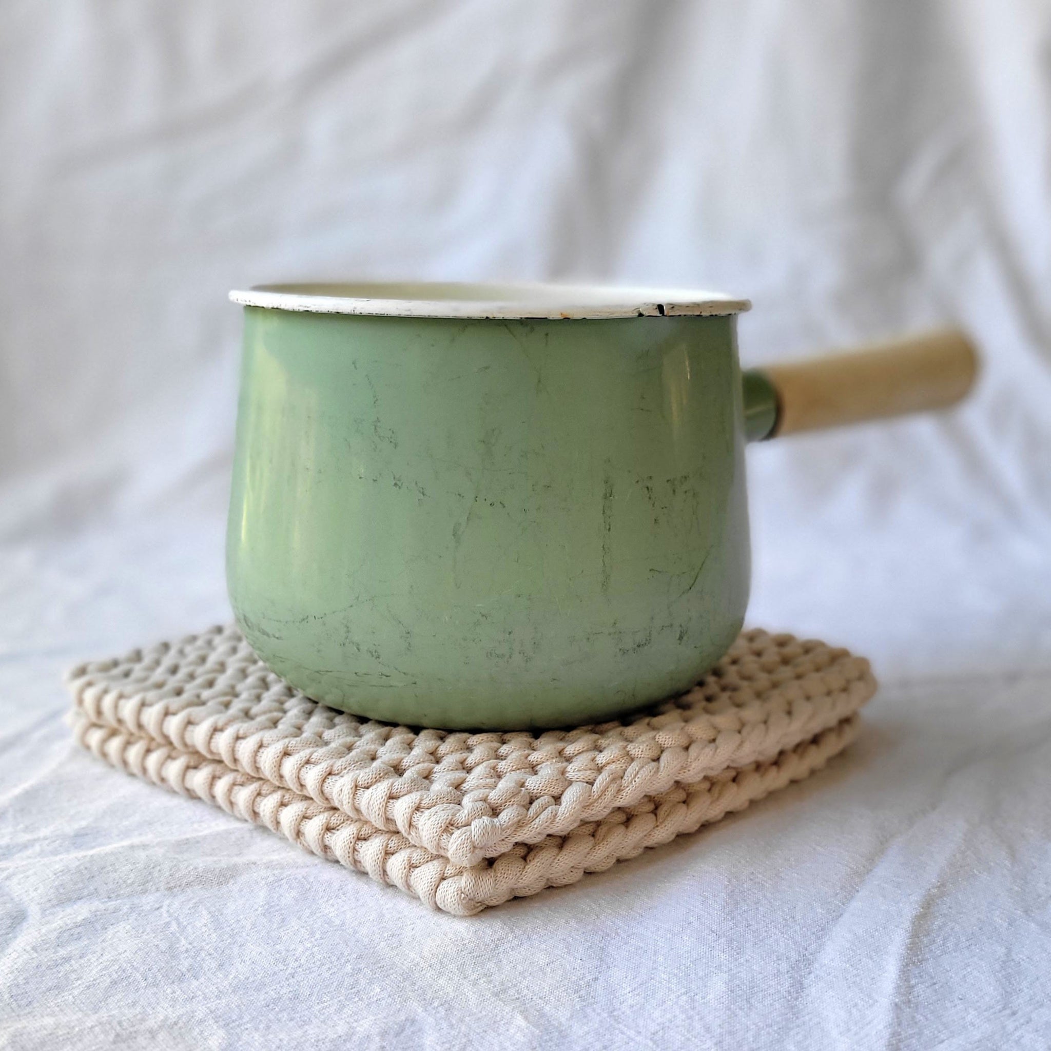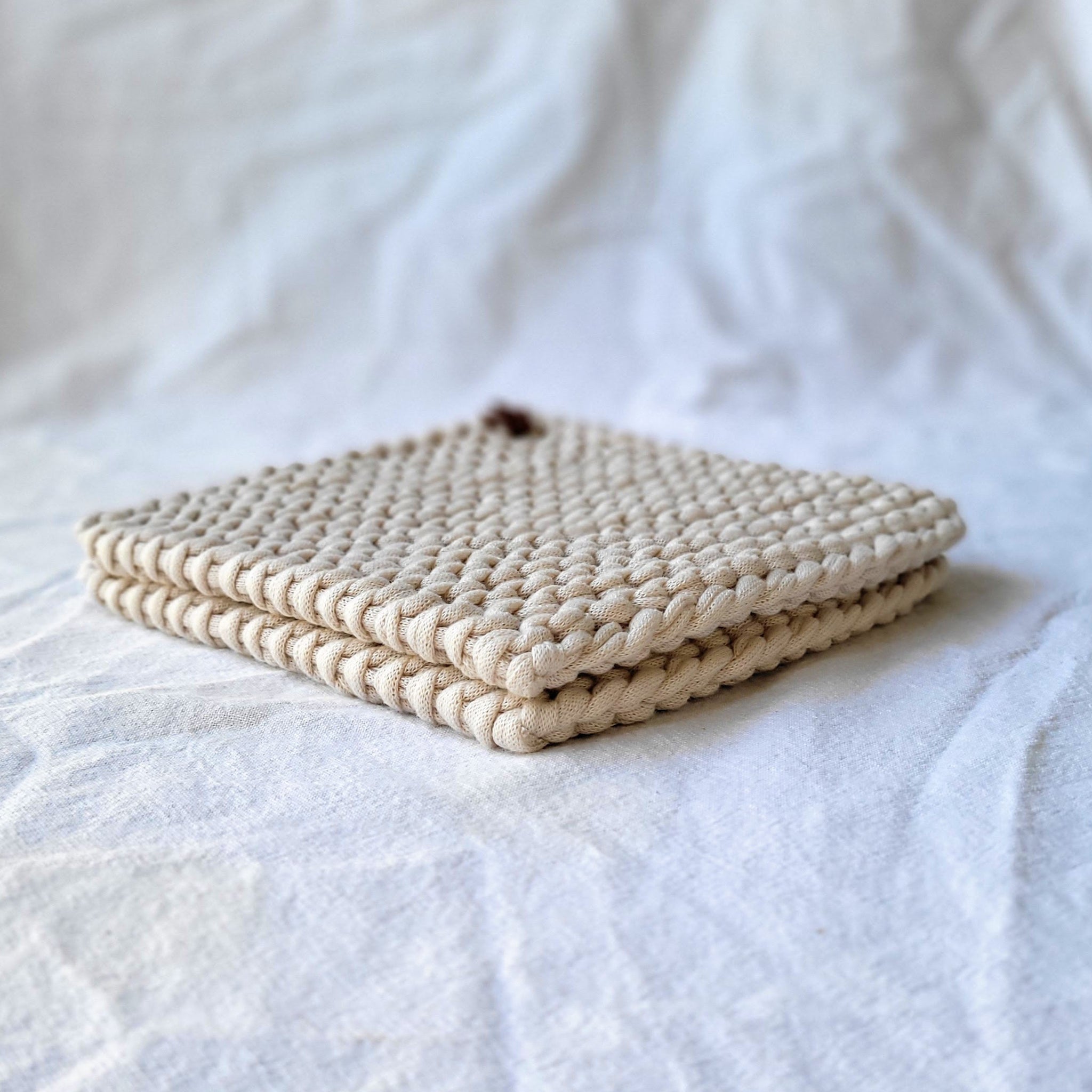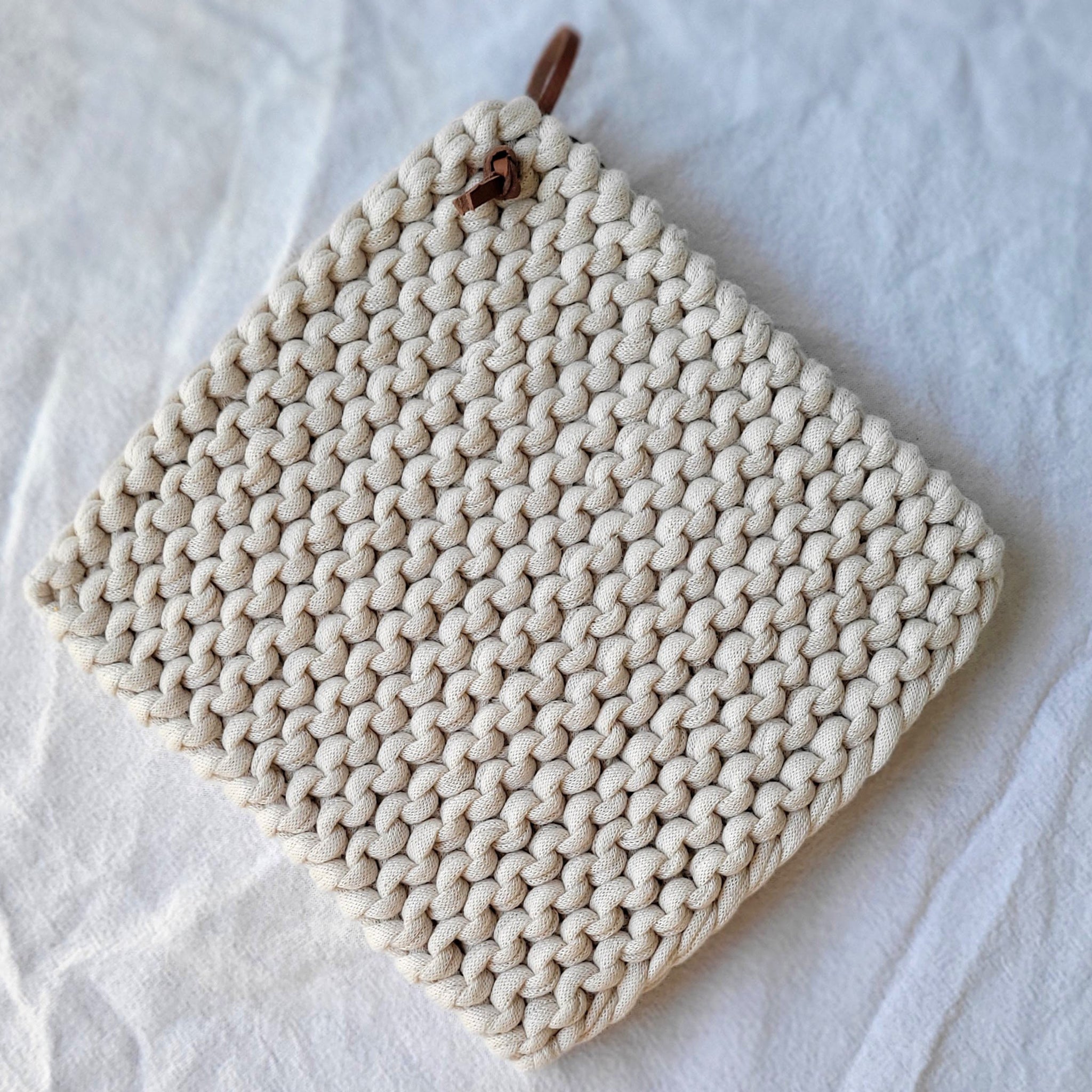 Set of 2 crocheted trivets, made from recycled textile waste, vegan leather handle, handmade in Portugal, color: cream