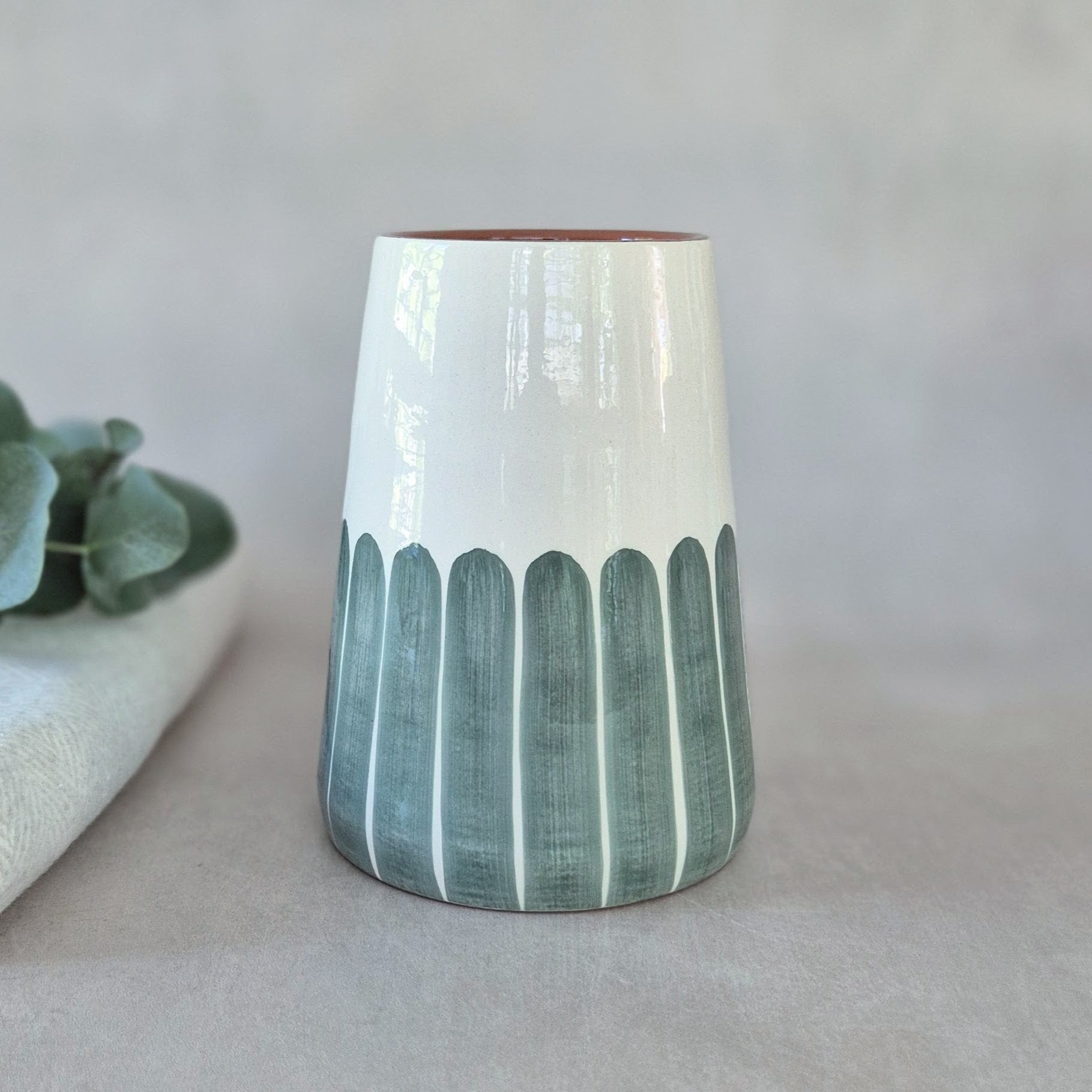 Vase Vulkan mittelgross aus Keramik, handgefertigt und handbemalt in Portugal, Farbe: Säulen eukalyptus