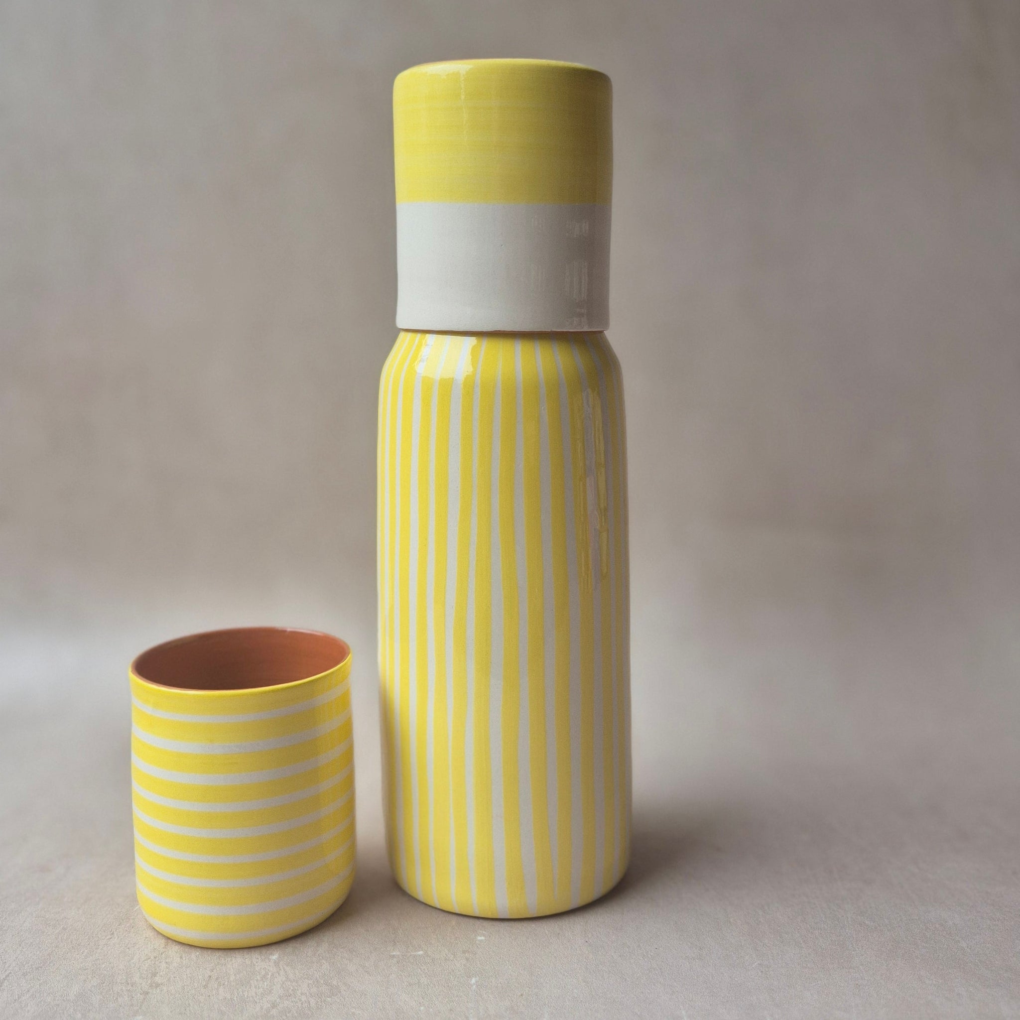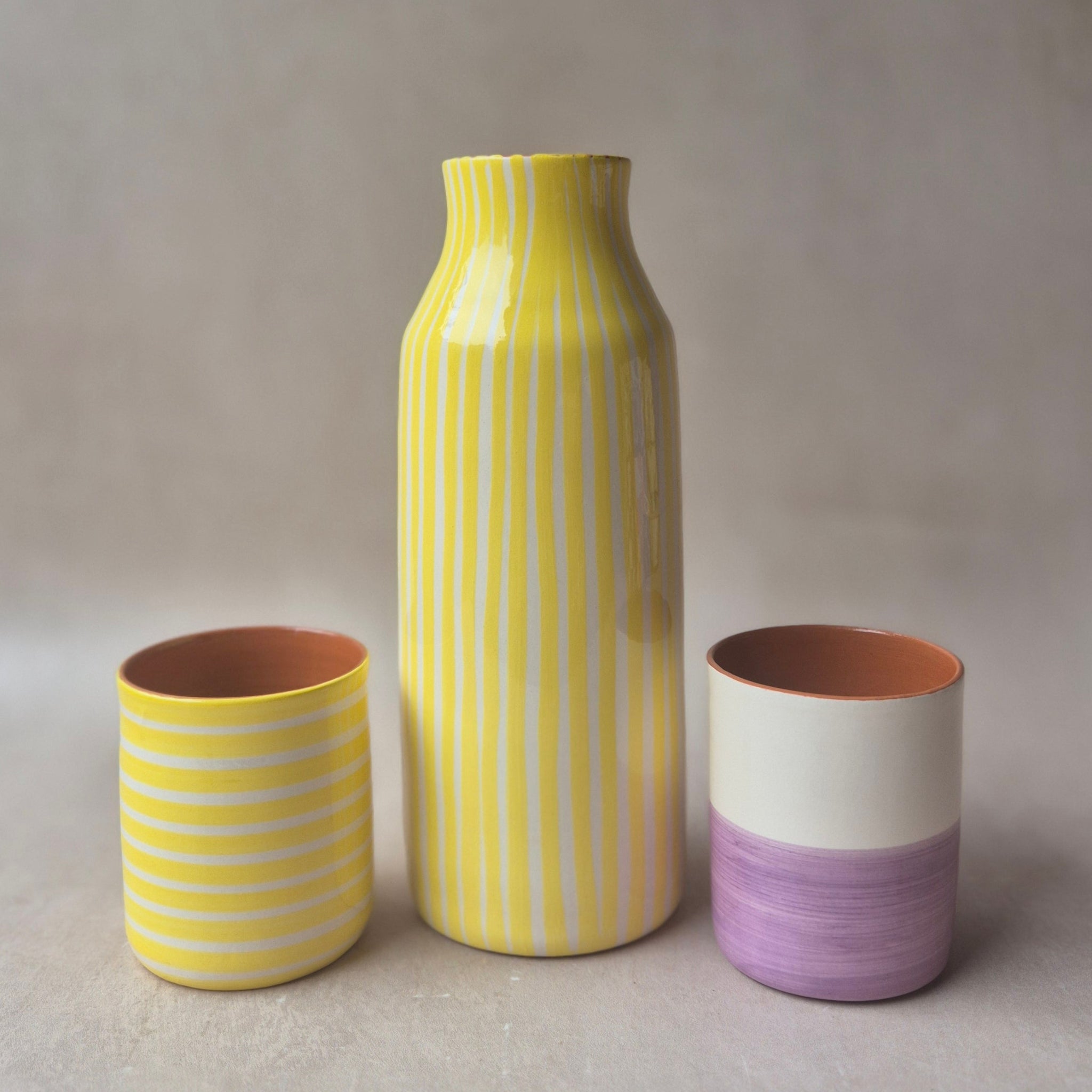 Karaffe aus Keramik, handgefertigt und handbemalt in Portugal, Farbe: gestreift zitrone