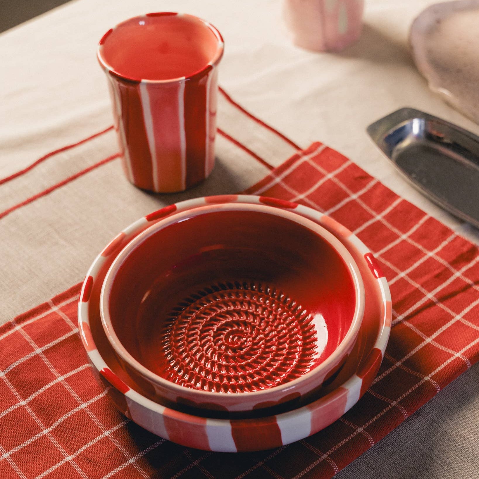 Diese vielseitige, handbemalte Keramikschale mit Reibe ist perfekt für alle, die Stil, Funktion und Liebe zum Detail in der Küche schätzen. Du kannst die Schale einfach zum Servieren verwenden - oder als Reibe, denn die Innenfläche ist aufgeraut. Sie eignet sich sehr gut zum zum Reiben von Knoblauch, Ingwer, Hartkäse, Schokolade, Zitrusschalen, Muskatnuss oder weiche Früchte/Gemüse wie Erdbeeren oder Tomaten.