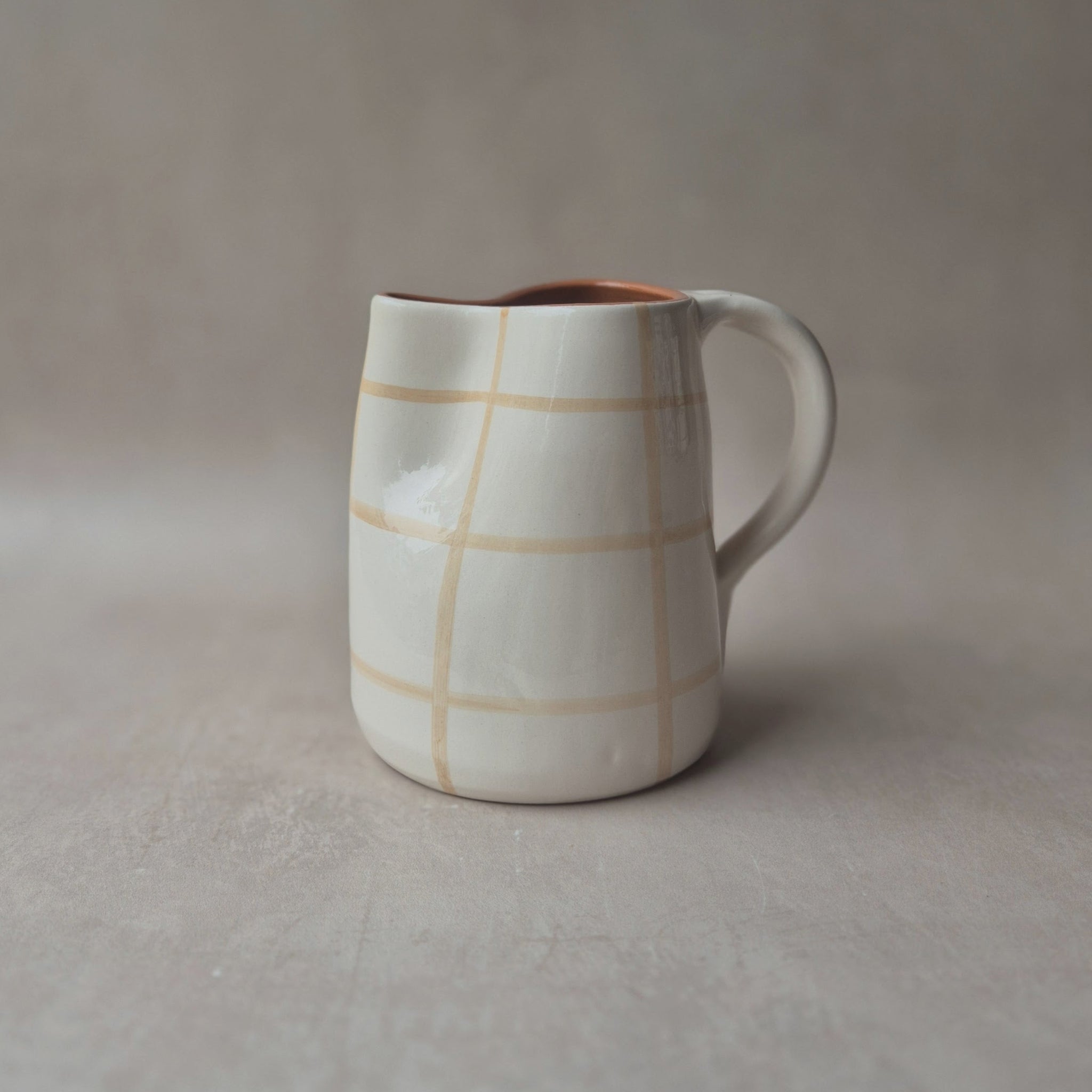 Krug aus Keramik, handgefertigt und handbemalt in Portugal, Farbe: kariert beige