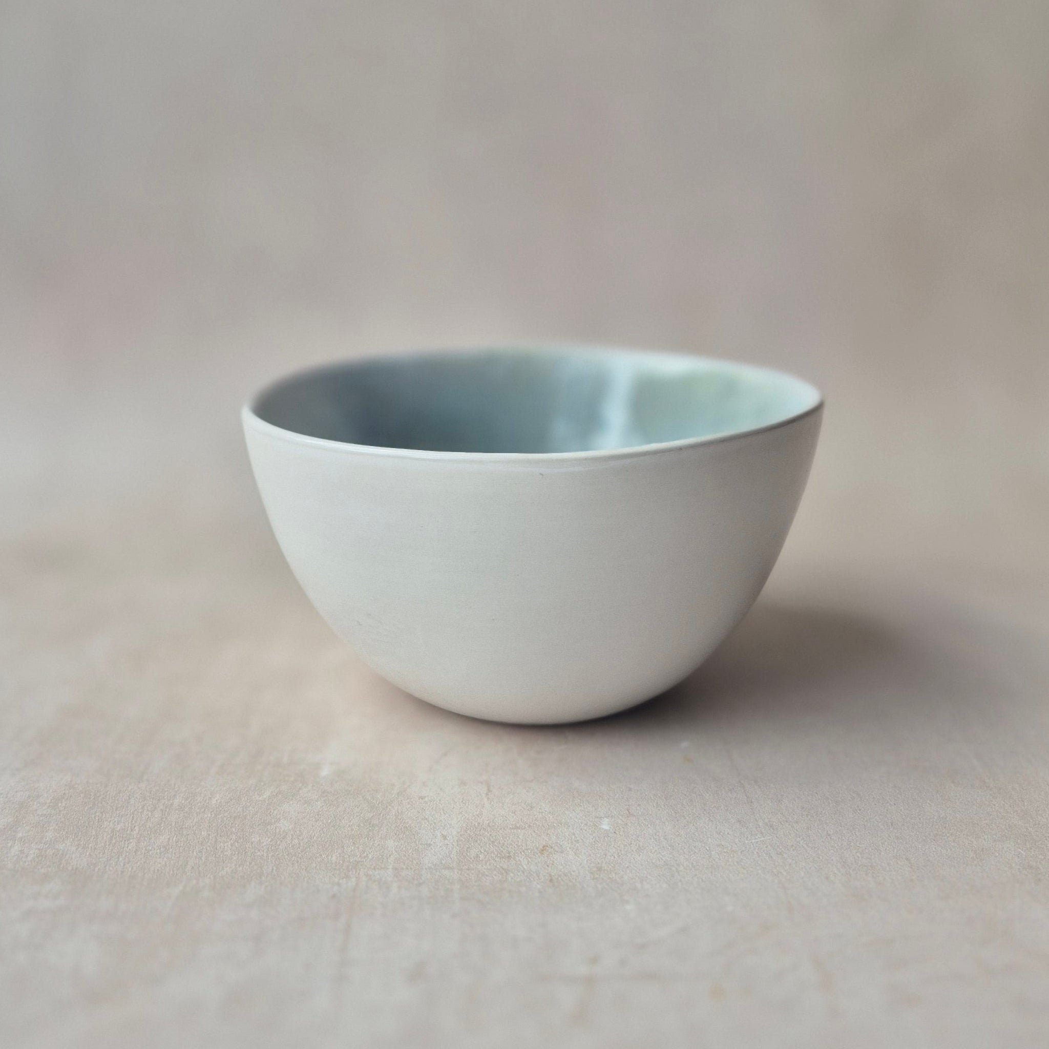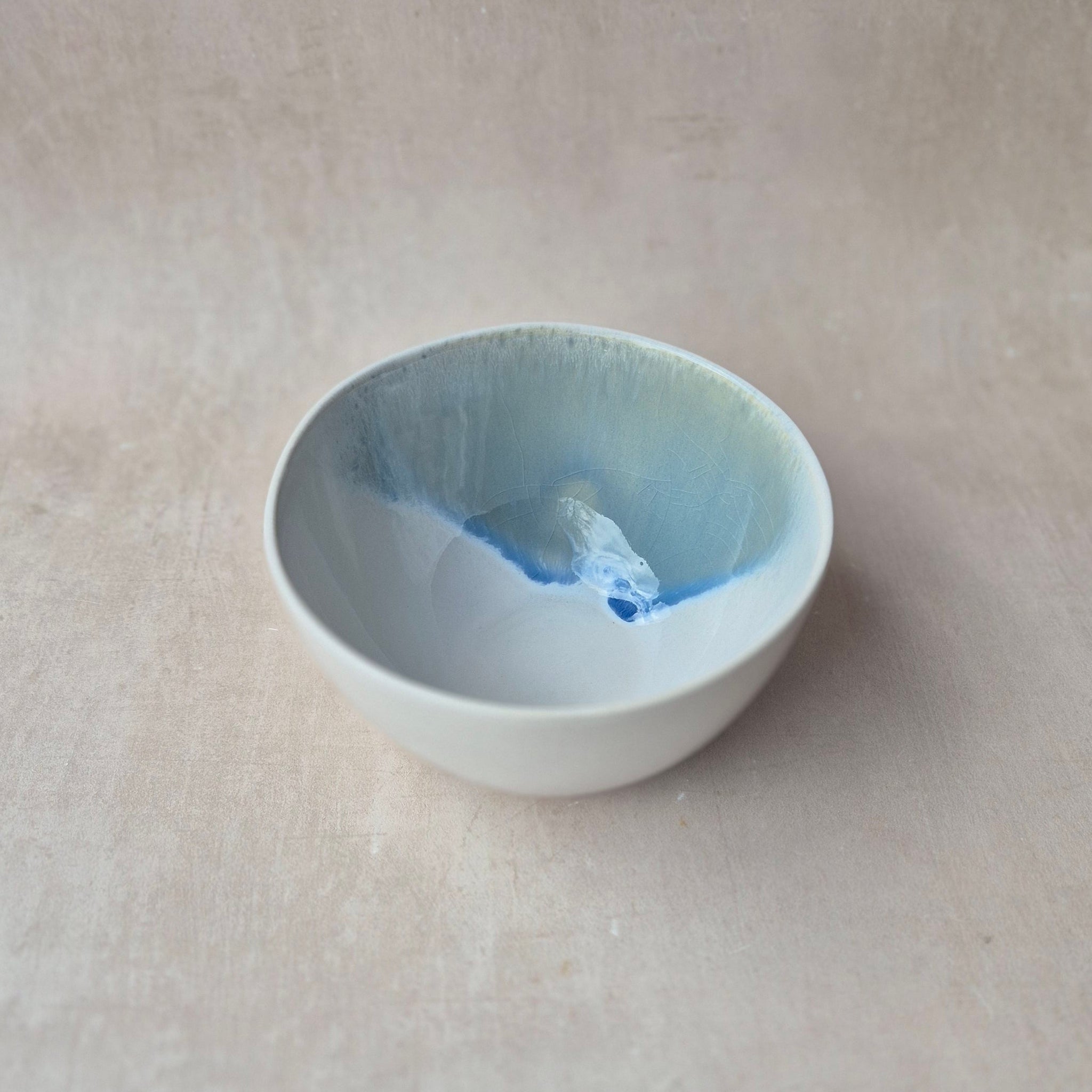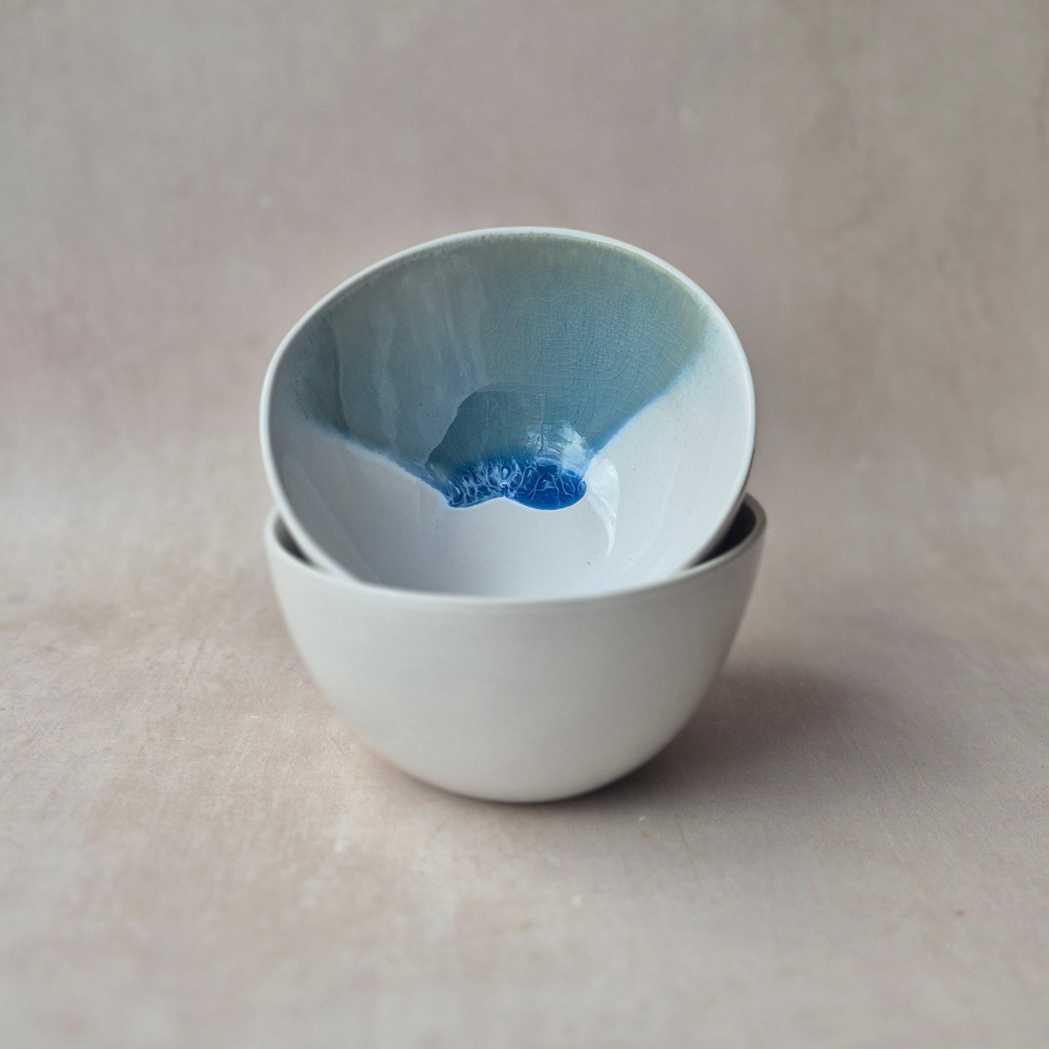 Müslischüssel aus Steingut, glänzend reaktiv glasiert, handgemacht in Portugal, Farbe: blau-petrolfarbene Glasurwelle (innen), weiss (aussen)