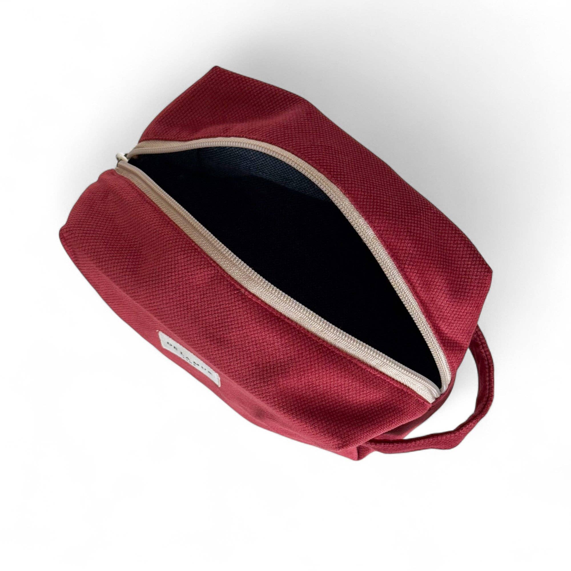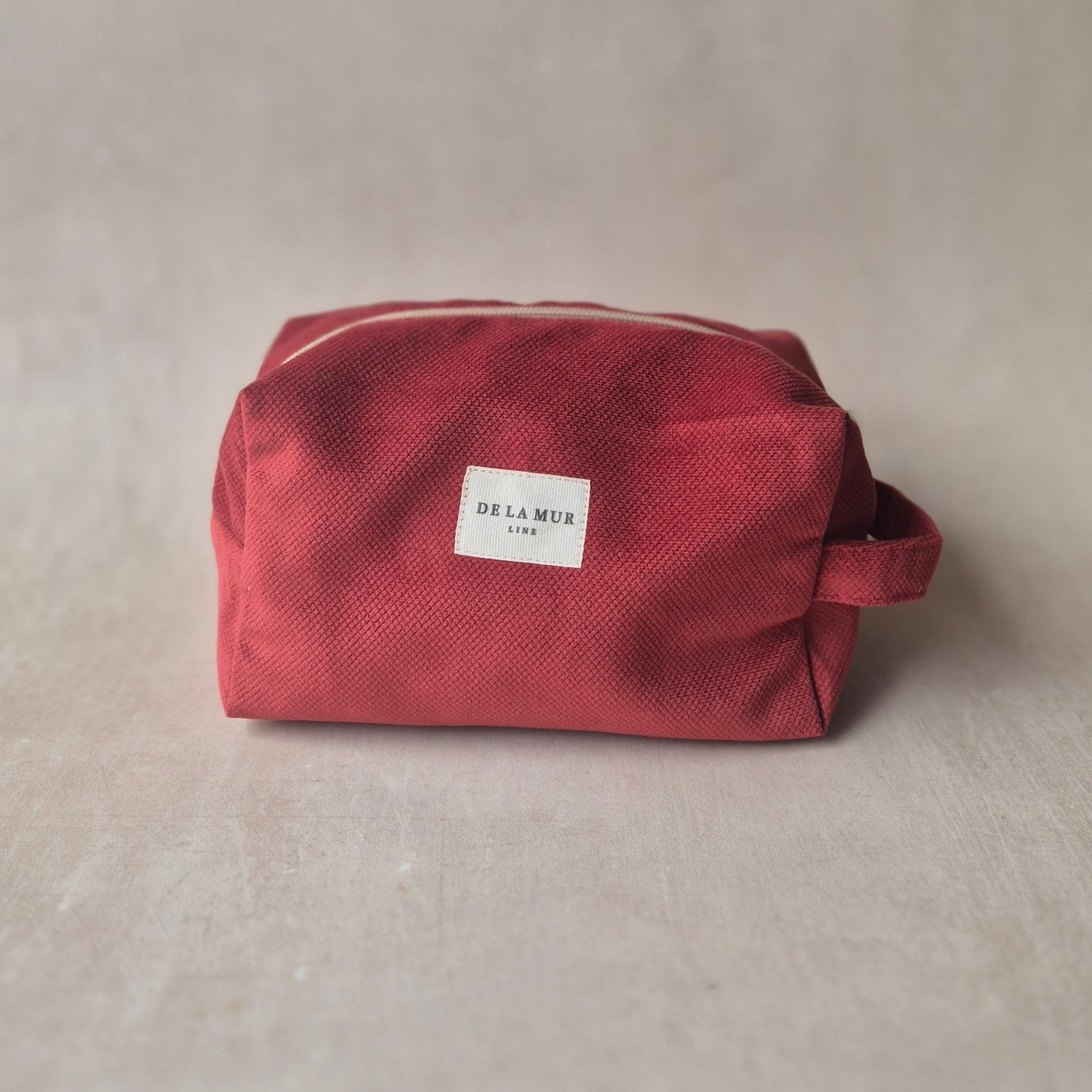 Stilvolles, praktisches und nachhaltiges Necessaire mit Reissverschluss oben und seitlichem Griff für einfachen Transport.
