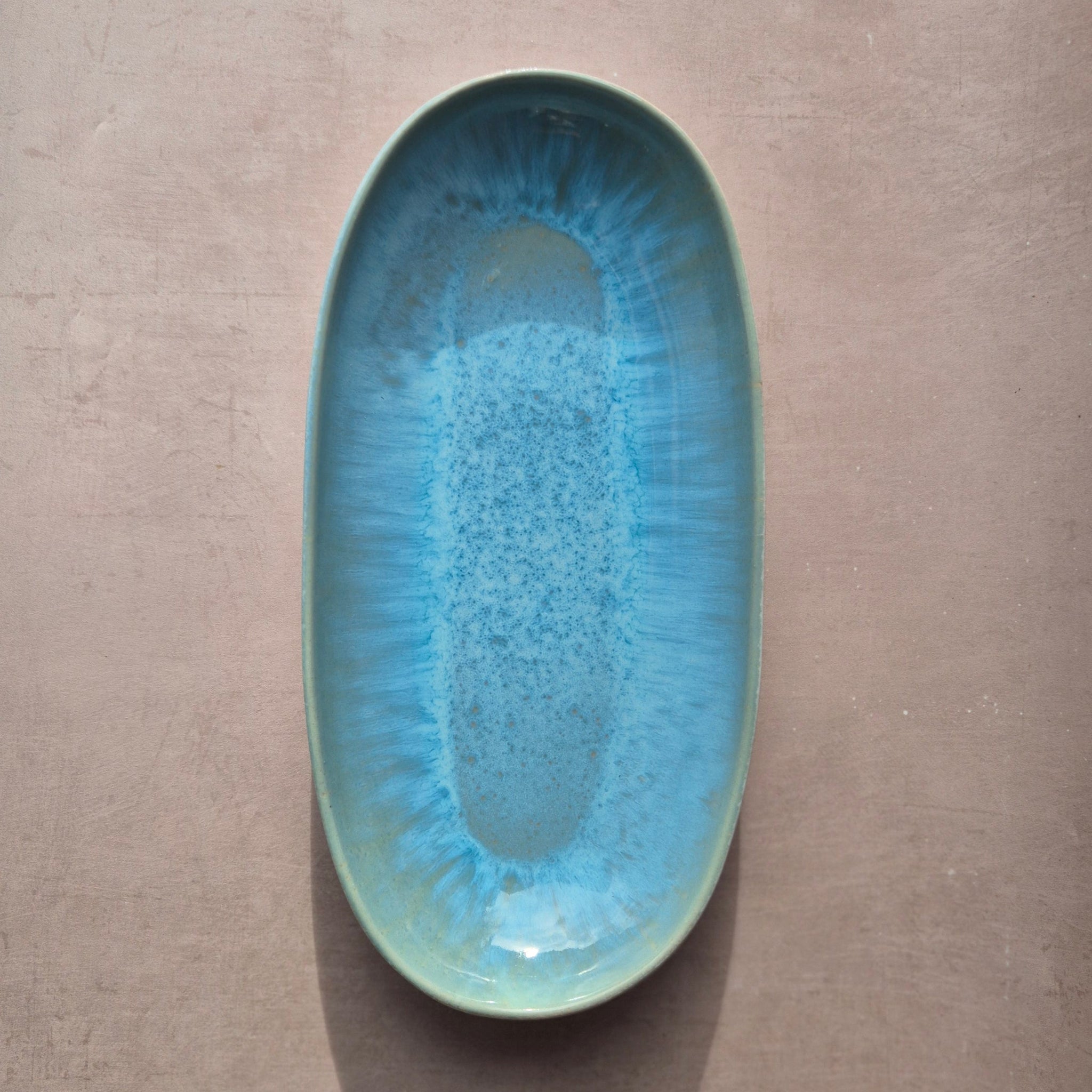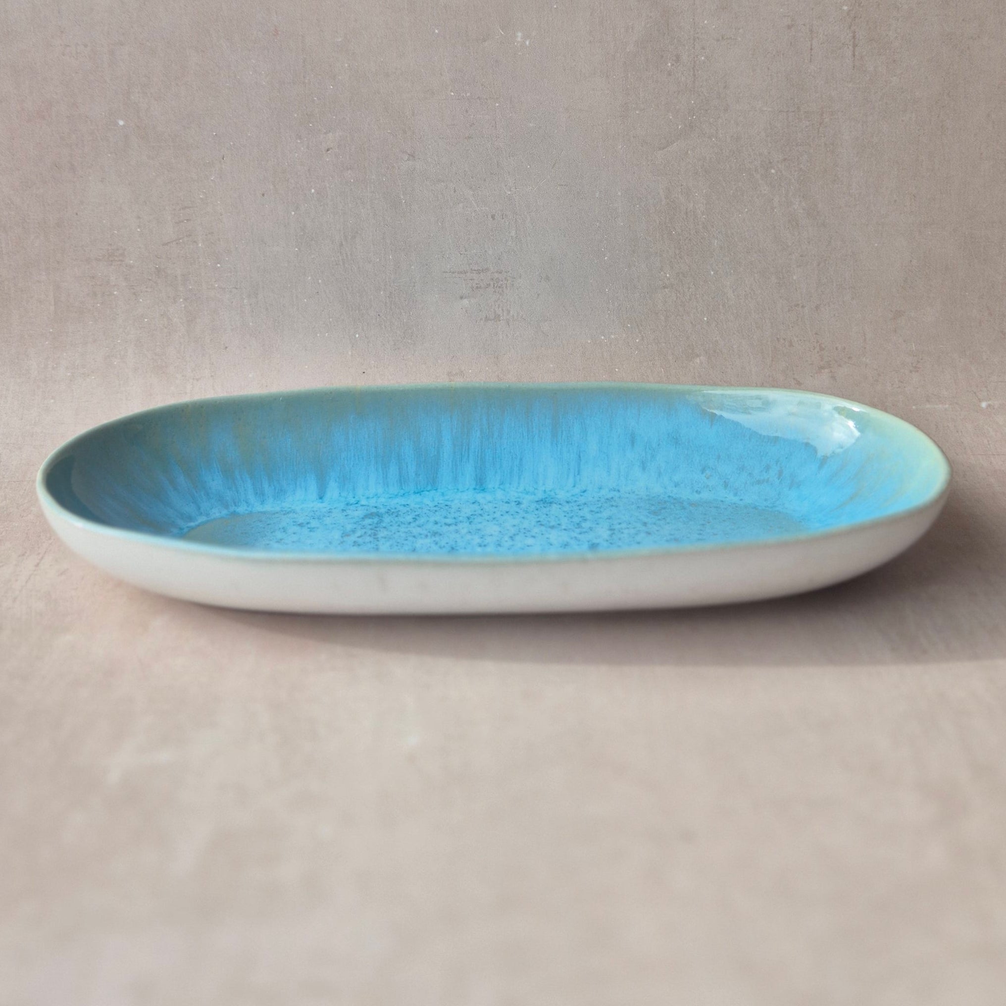Mittelgrosse Servierplatte aus Steingut, handgfertigt in Portugal, glänzend reaktiv glasiert, Farbe: türkis