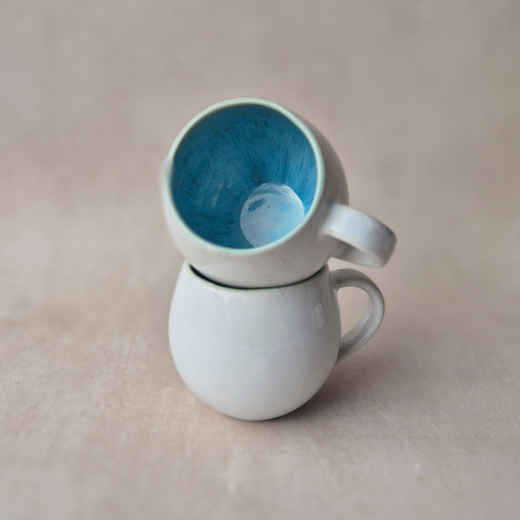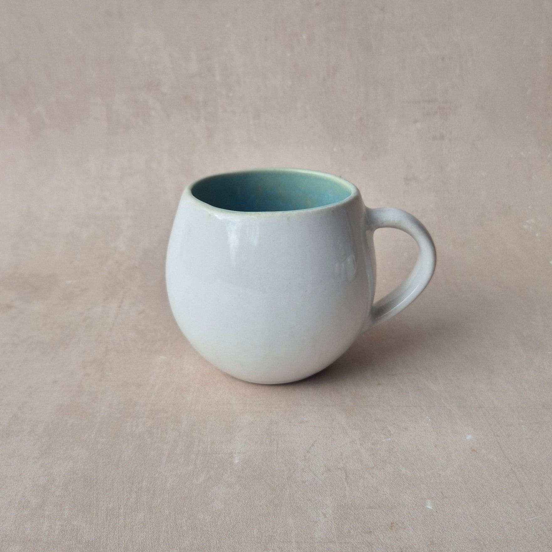 Kugelige Tasse aus Steingut mit glänzender, reaktiver Glasur innen, handgefertigt in Portugal, Farbe: weiss (aussen), petrol (innen)