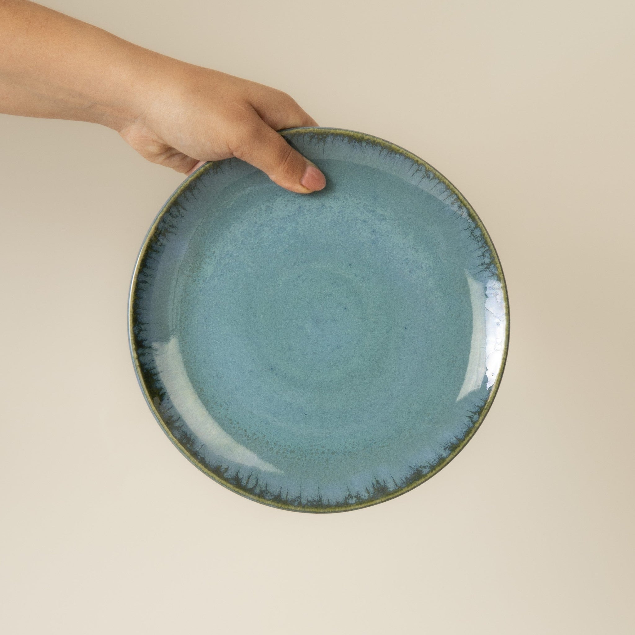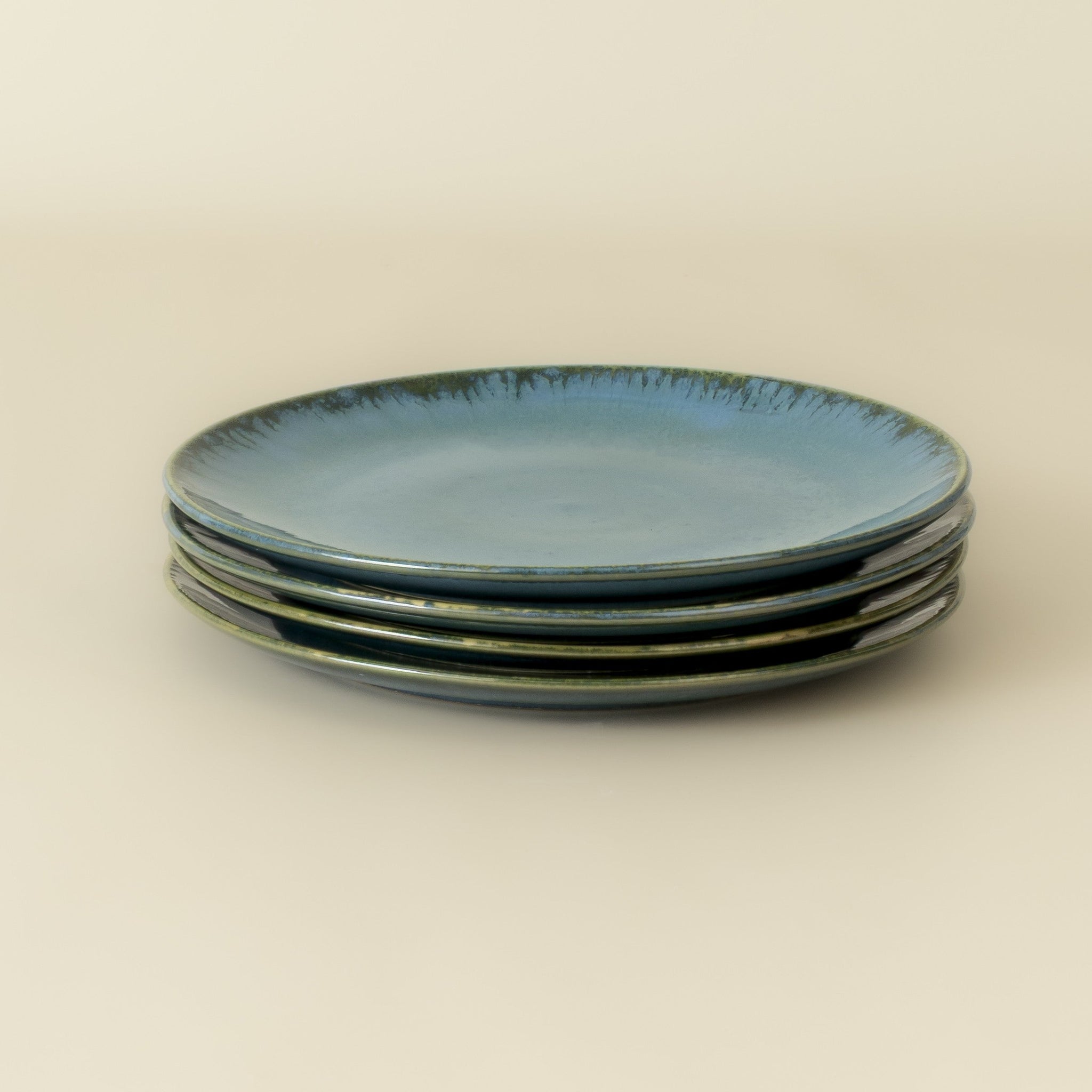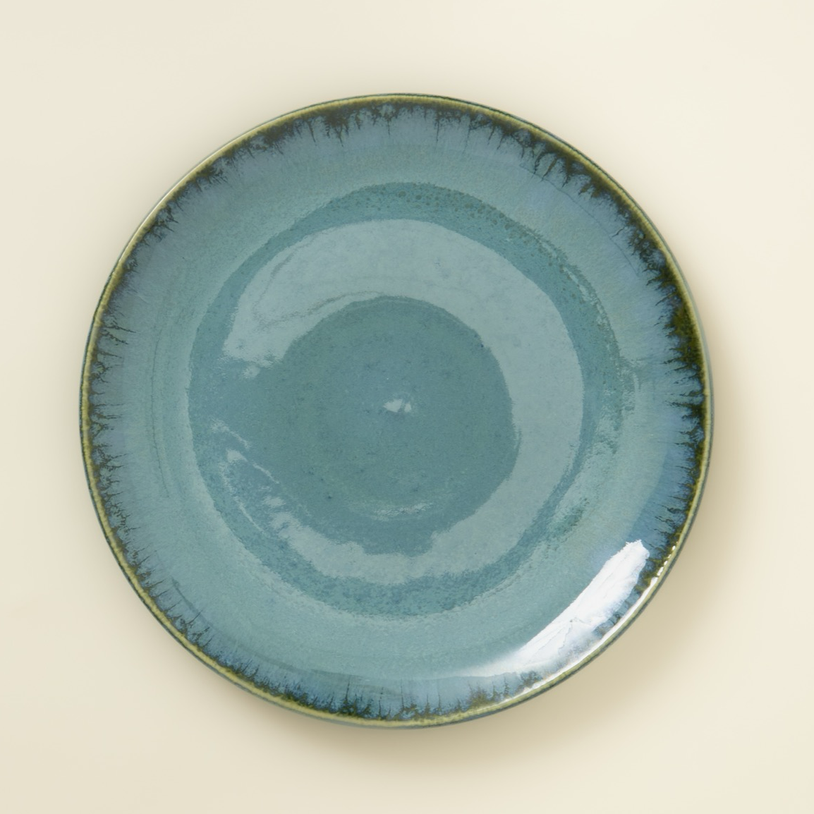 Kleiner Teller aus hellem Steingut mit reaktiver, glänzender Glasur, handgefertigt in Portugal, Farbe: petrol
