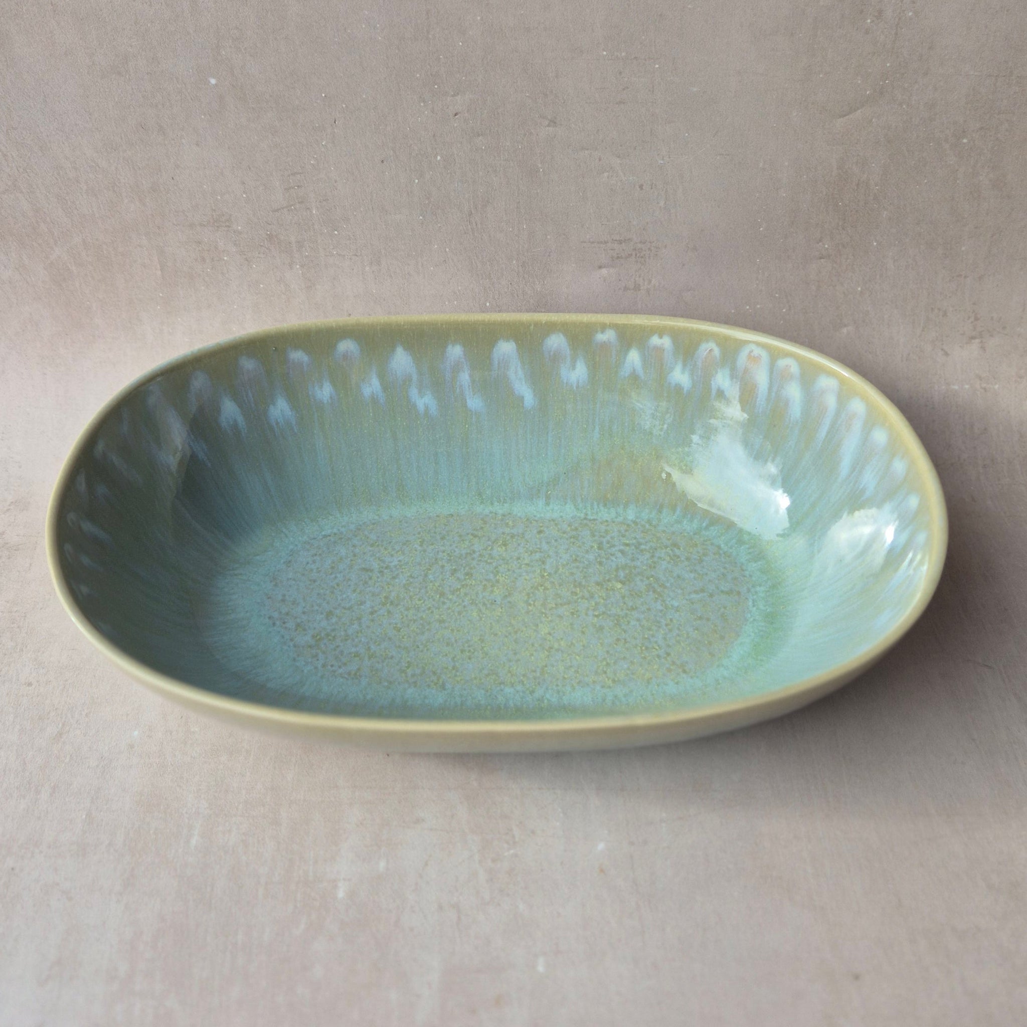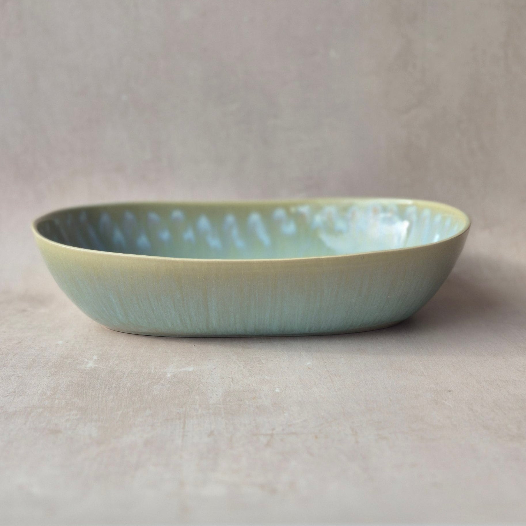 Grosse, längliche, tiefe Servierform aus Steingut, glänzend reaktiv glasiert, handgefertigt in Portugal, Farbe: mint, grün